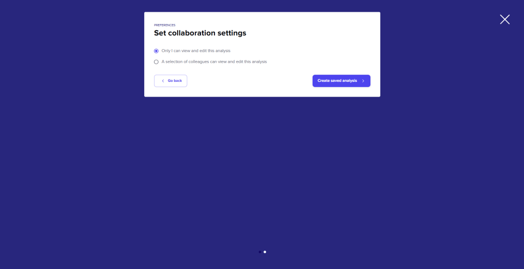 Achieving the exact visualization that meets your specific needs can sometimes require a bit of fine-tuning. To reuse a specific configuration in the future, you can save it for later use. To do this, click ‘Save analysis’, enter a name for your analysis, and click ‘Continue’. If you wish to share the analysis with your colleagues, select the second option on the following screen before saving.