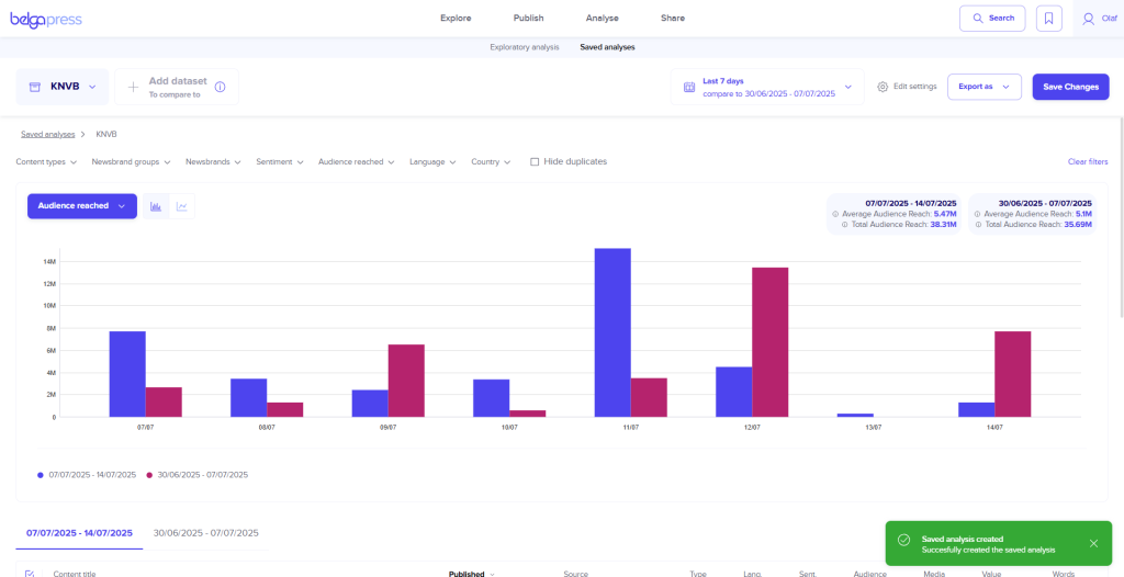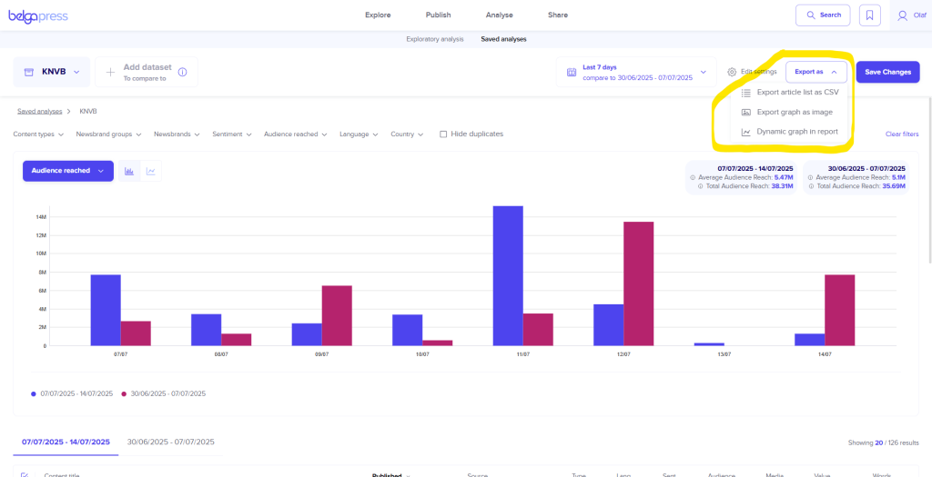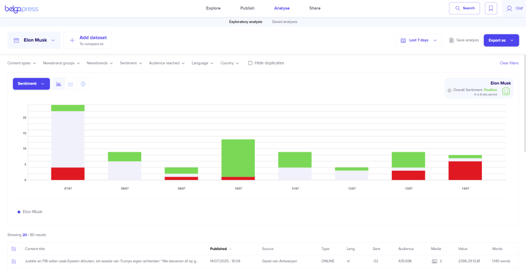 Within the dedicated analysis section, you can graphically view the results for each of these parameters over any given period. This is combined with a view of the specific articles underlying each chart. Adjust the filters yourself and instantly see every updated chart. You can export the results in CSV format, as a PNG for use in presentations, or even as a dynamic chart within a report.