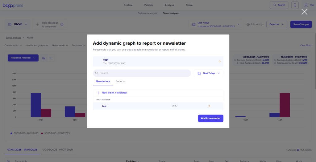 The most efficient way to integrate your chart into a Belga.press analysis report is the third option: exporting it as a ‘dynamic graph in report’. In the following screen, select the newsletter or report where you wish to include the chart. If you have not created one yet, select ‘new blank report/newsletter’. Once you click ‘add to report’, your chart will be included. You can then repeat this process for other charts or begin editing your report or newsletter. For detailed instructions on this process, please refer to the relevant sections of this manual. The primary advantage of using dynamic charts is the ability to add annotations directly within your newsletters or reports. This allows you to provide your audience with essential context or meaning behind specific peaks or dips in your analysis.