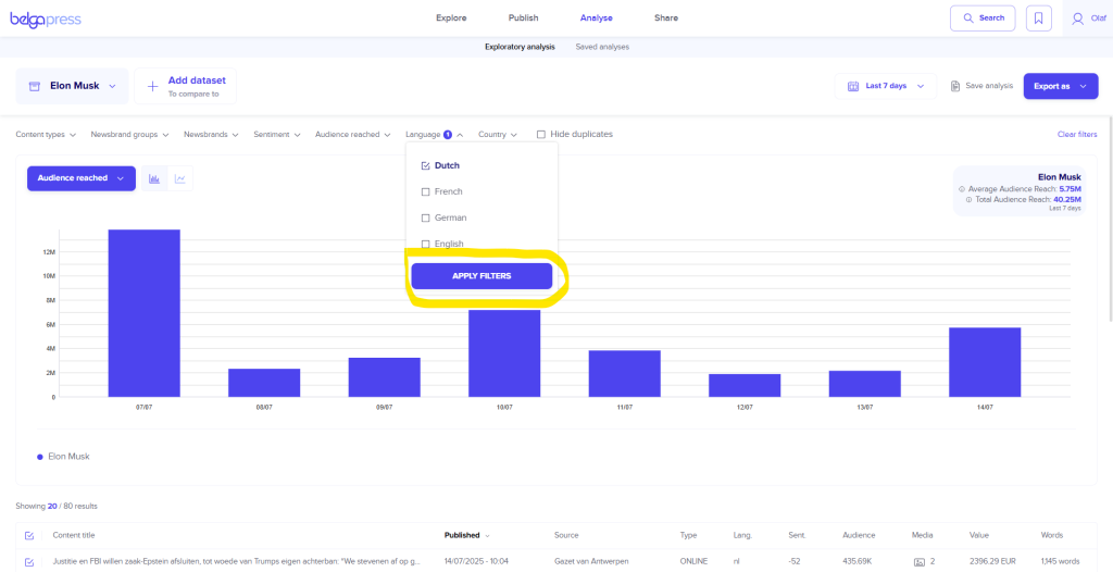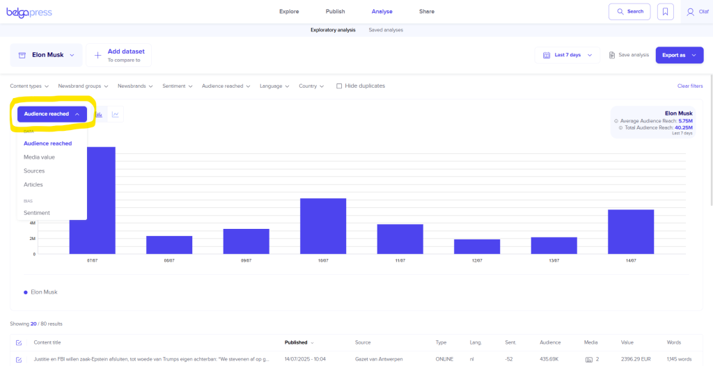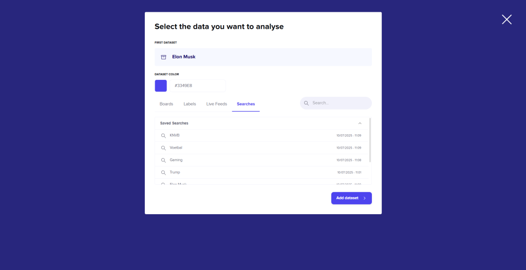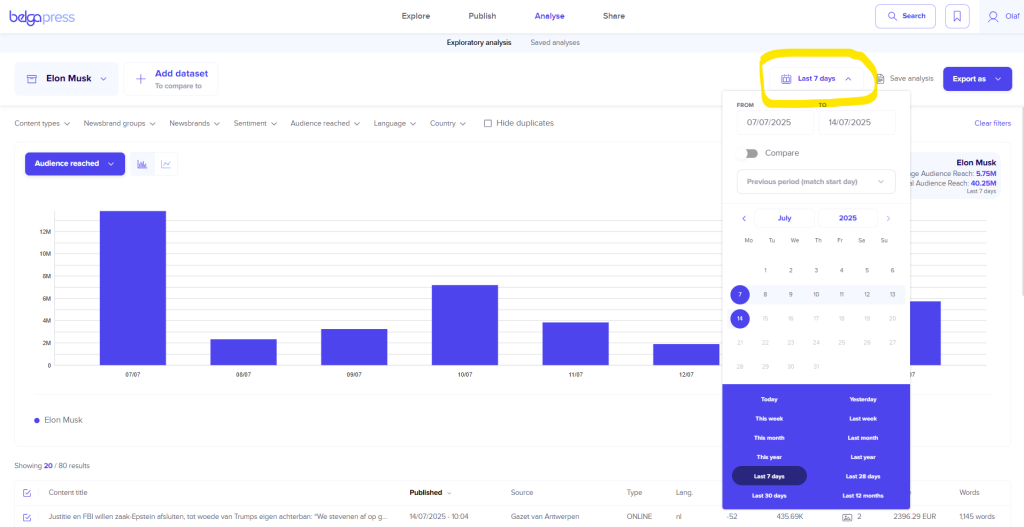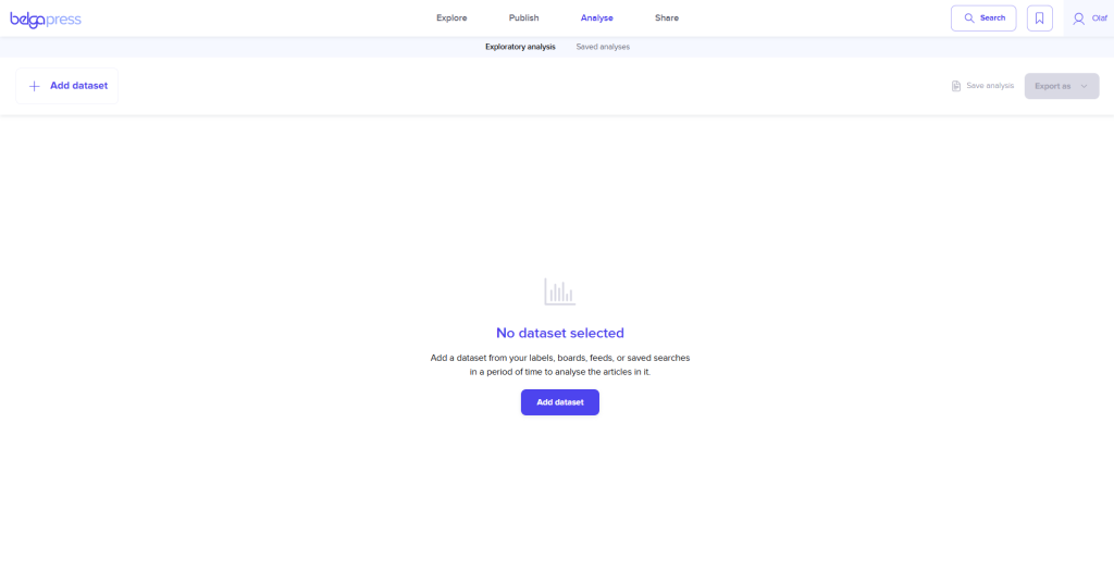 Every analysis begins with the selection of a dataset. As mentioned above, you have full control over what you wish to analyze. If you opt for a board, label, or live feed, please be aware that you will only include articles from the moment that set was created. If you would prefer a perspective over a broader period, choose a “saved search” instead.