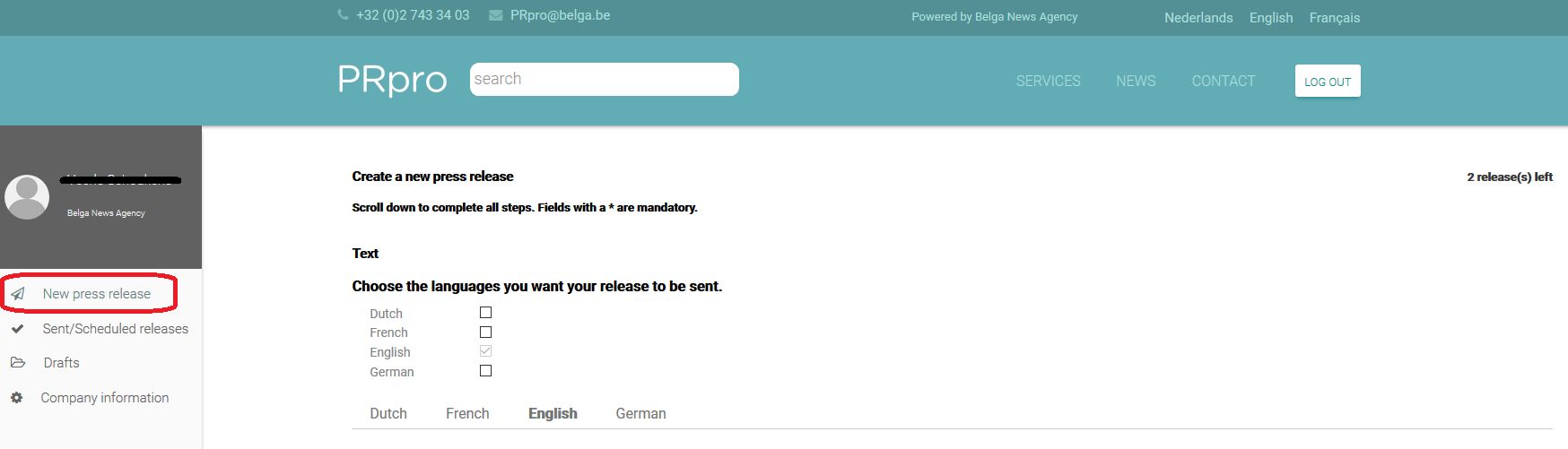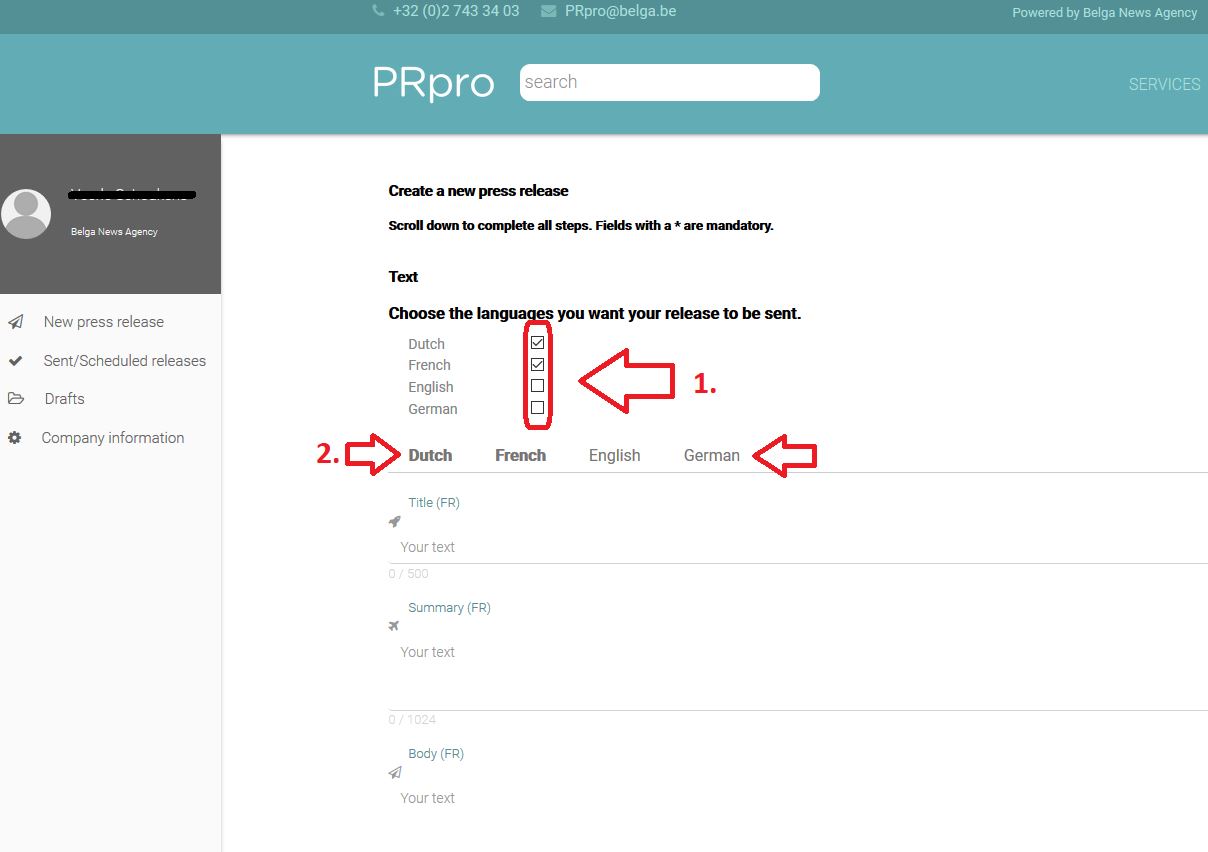 - Via de tabbladen kan u switchen tussen de talen en uw persbericht in versschillende talen ingeven