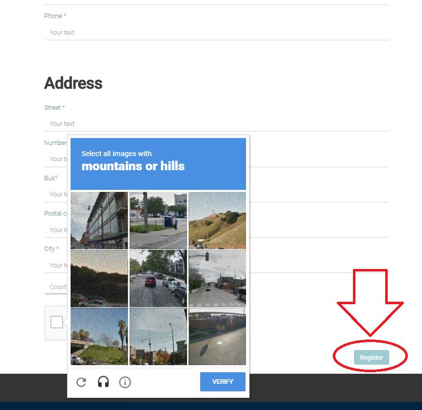 Wanneer u alle velden ingevuld heeft, een login en paswoord heeft aangemaakt en de Captcha correct heeft afgehandeld, klikt u op “Register”